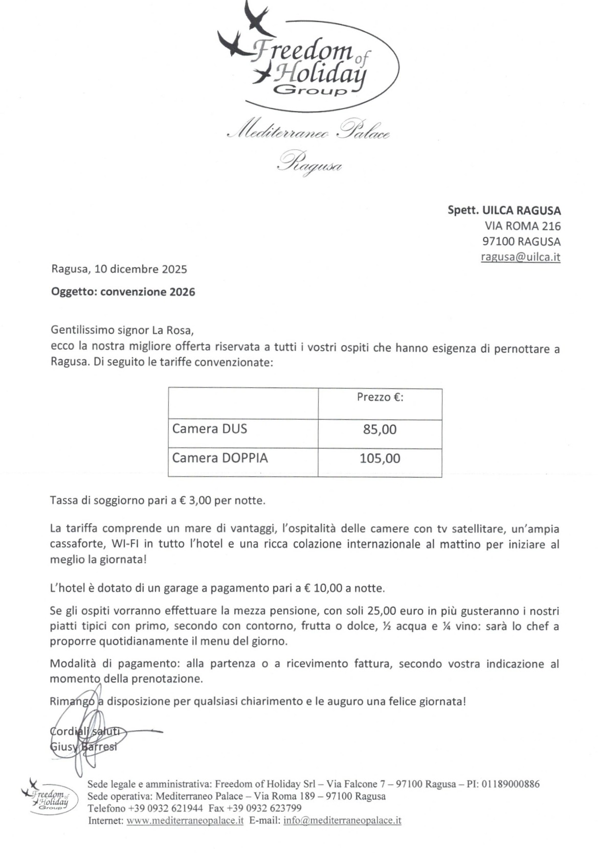 HOTEL MEDITERRANEO PALACE RAGUSA Pubblicato il 18 Dicembre 202518 Dicembre 2025 di Sanfratello Antonino HOTEL MEDITERRANEO PALACE Freedom of Holiday Group Via Roma 189 97100 RAGUSA info@mediterraneopalace.it +39 0932 621944 +39 331 1377751 L’HOTEL MEDITERRANEO PALACE di Ragusa riserva agli iscritti UIL condizioni particolari come da brochure. Condividi Pubblicato in Convenzioni, Viaggi e turismo e taggato #hotelmediterraneopalace.